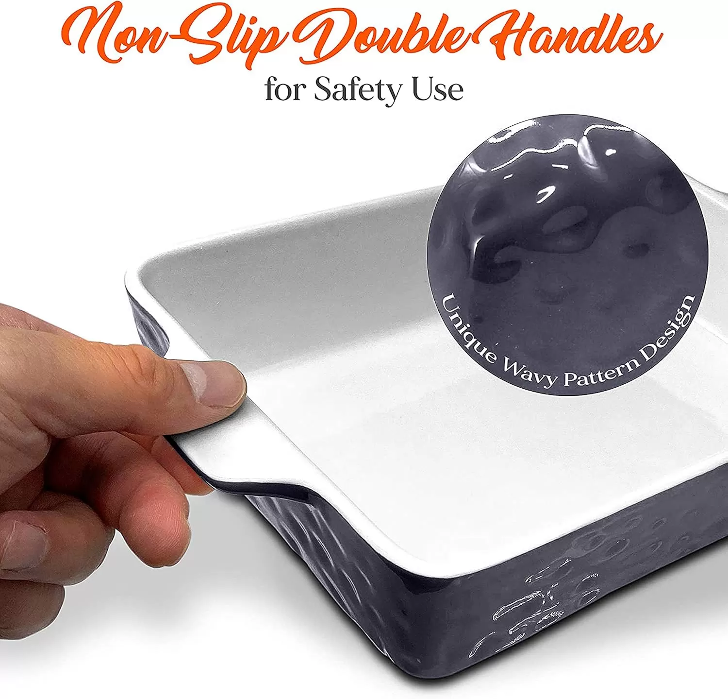 3-Pcs. Rectangular Ceramic Bakeware Set – Durable Baking Dishes Set, Odor-Free Hybrid Ceramic Non-stick Baking Pans, Dishwasher Safe (Red) Features: • Made of High-Quality Glaze • Attractive, Stylish Non-Stick Ceramic Coating • Premium Food Grade Bake Pan Construction • Unique Wavy Pattern Design • Environmental-Friendly Baking Pans • Long-Lasting Color, Stain-Resistant, and Easy Clean Up • Durable and Safety under High Temperature • Exquisite Double Ear Handles Design • Dishwasher Safe with Porcelain and Crystal Washing Function • Non-slip Double Handles for Safety Use • Can be used in the Oven, Microwave, and Refrigerator • No Direct Fire and Induction Cooker Allowed • Great for Food Prep, Serving, Cooking, Sweet Treats, Pastry Dessert Baking • PTFE/PFOA/PFOS Free What's in the Box: • Large Ceramic Baking Pan • Medium Ceramic Baking Pan • Small Ceramic Baking Pan Technical Specs: • Temperature Resistance: Up to 446° Fahrenheit (230° Celsius) • Construction Material: Non-Stick Ceramic Coating • Coating Thickness: 0.6mm • Large Size (L x W x H): 14.69'' x 8.5'' x 2.64'' -inches • Medium Size (L x W x H): 10.75'' x 6.89'' x 2.17'' -inches • Small Size (L x W x H): 7.87'' x 5.2'' x 1.69'' -inches • Sold as: 1 • Weight: 8.72 lbs.