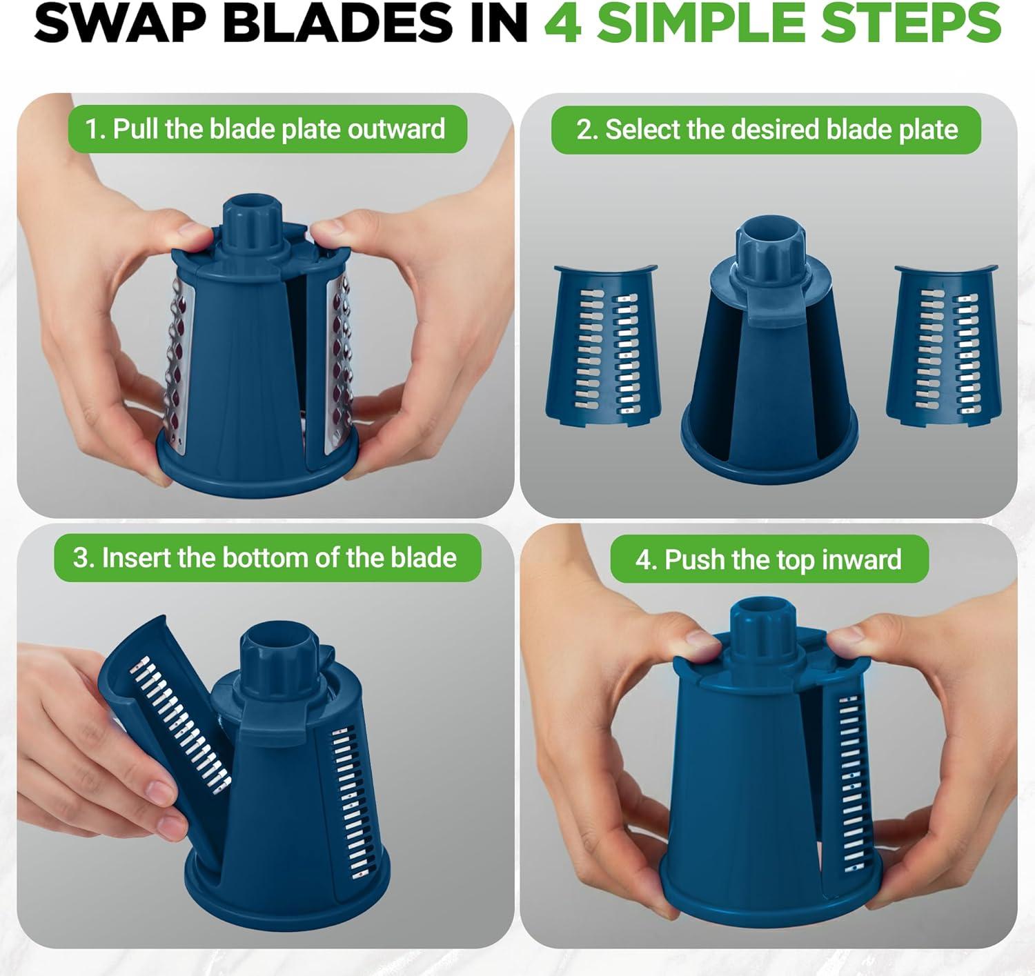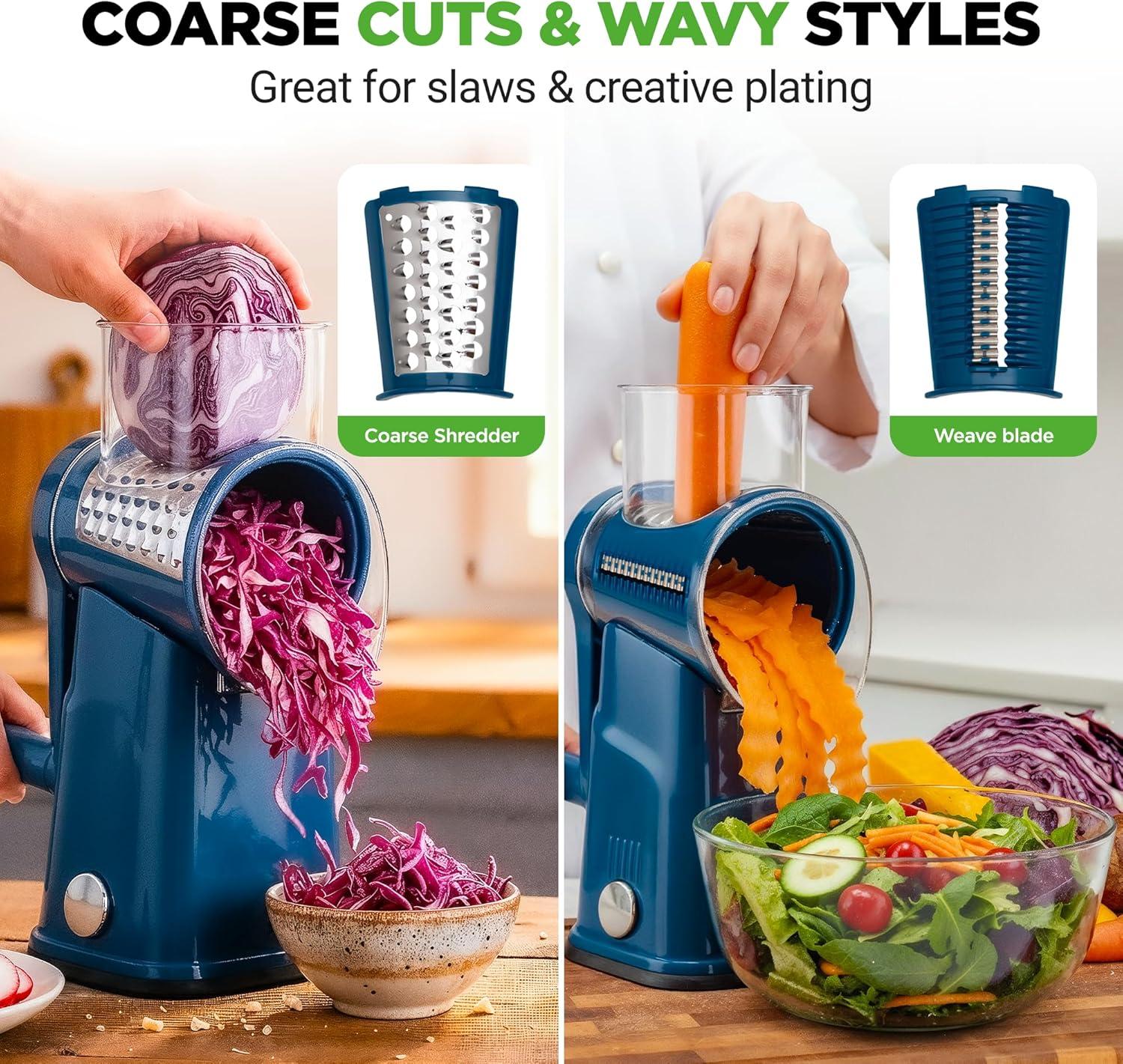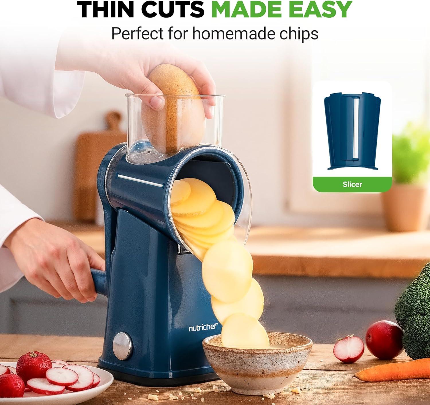 The NutriChef Rotary Cheese Grater with Handle is a versatile and efficient kitchen tool designed to make grating cheese, vegetables, and other ingredients quick and easy. Equipped with five interchangeable drum blades, this grater offers a range of options to meet your culinary needs. Whether you’re shredding cheese, cutting vegetables, or preparing salads, this rotary grater ensures fast and consistent results every time. The ergonomic handle makes it comfortable to use, while the sturdy suction base secures the device firmly to your countertop, preventing any slipping or accidents during use. The design is both user-friendly and safe, with an easy assembly and blade change process. The button knob securely locks the blades in place for added safety. The compact size of this grater saves valuable counter space, and it comes with a storage container to save the grated eatables in it. Made from durable materials, including stainless steel blades and BPA-free plastics, the NutriChef Rotary Cheese Grater is built to last. Its versatility, efficiency, and ease of use make it a must-have kitchen tool for both novice and experienced cooks.