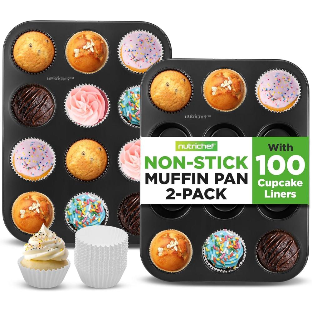 NutriChef Non-Stick 2-Piece 12 Cup Muffin Pans with 100 Parchment Cupcake Liners, Carbon Steel, Professional Grade Muffin Pans for Baking, Durable & Dishwasher Safe 13.7″x10.4″x1.1″ Inch (Black)
